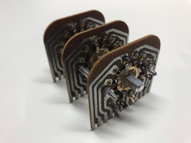 Centralab NOS (5) Position, Three deck rotary selector switch. A very nice quality switch originally made for H.H. Scott which appears to be intended for a PC type interface although each of the circuit traces can accept individual soldered lead connections if desired. Switch has a 1/4″ dia. shaft with 3/8″ dia. threaded mounting (hex nut included) by about 4″ inches long . This is a “Shorting” type switch. No further details are available…..This is non-returnable item.