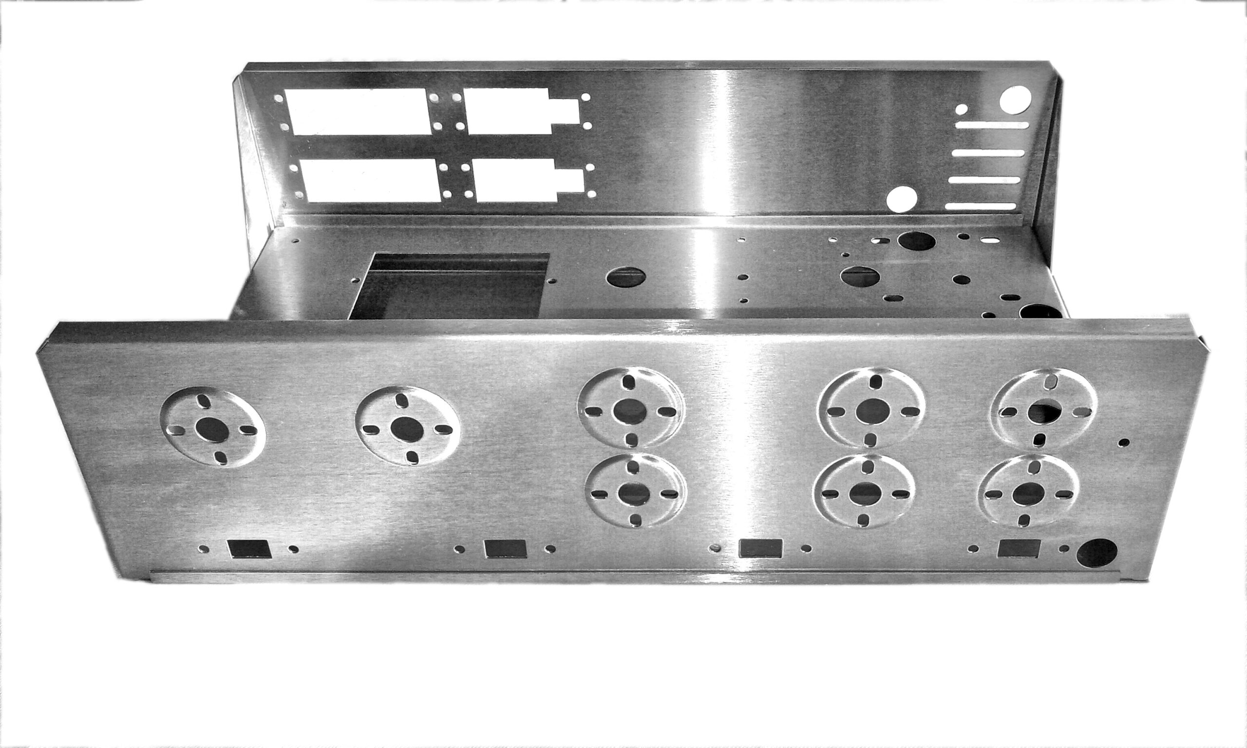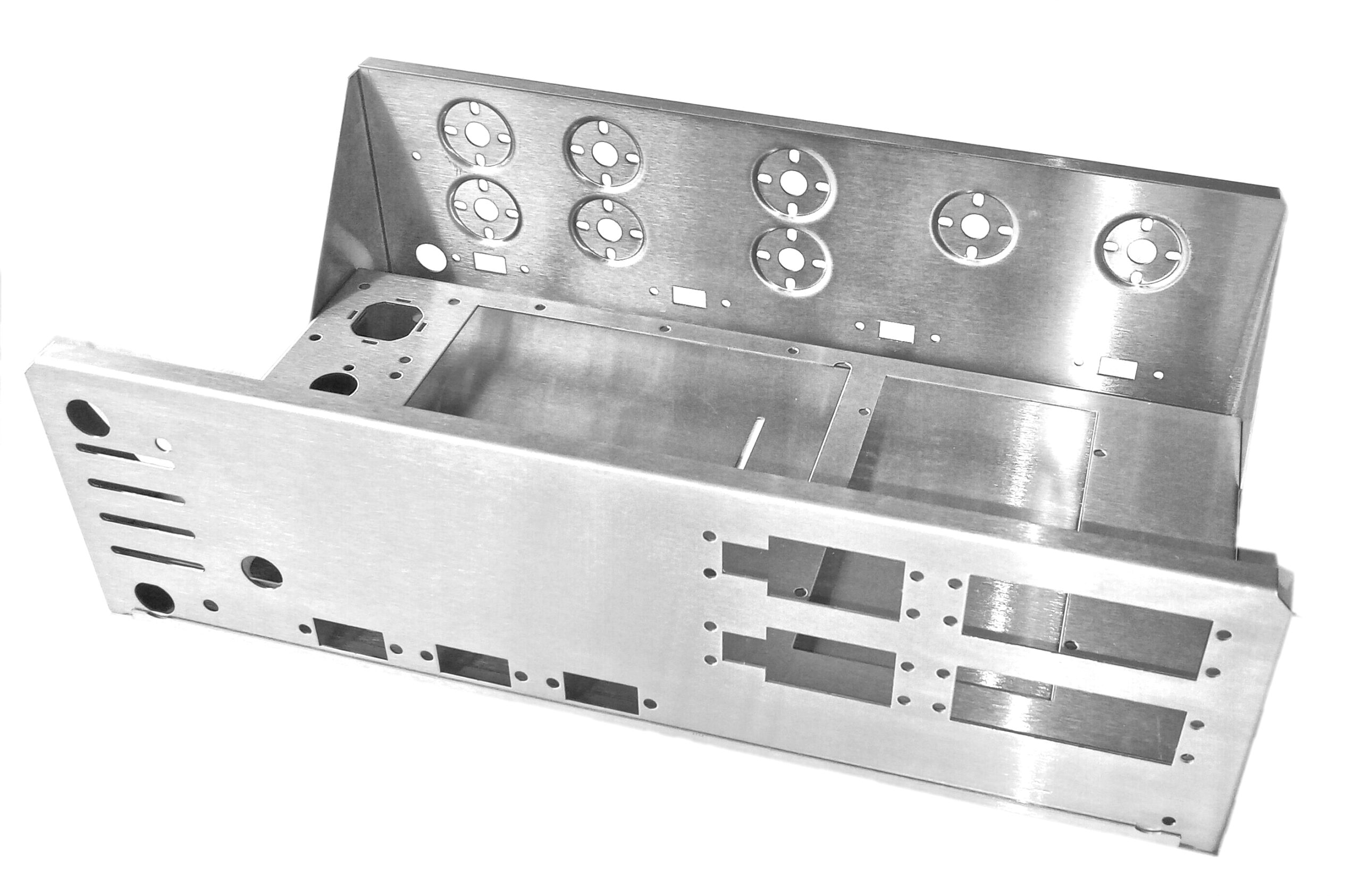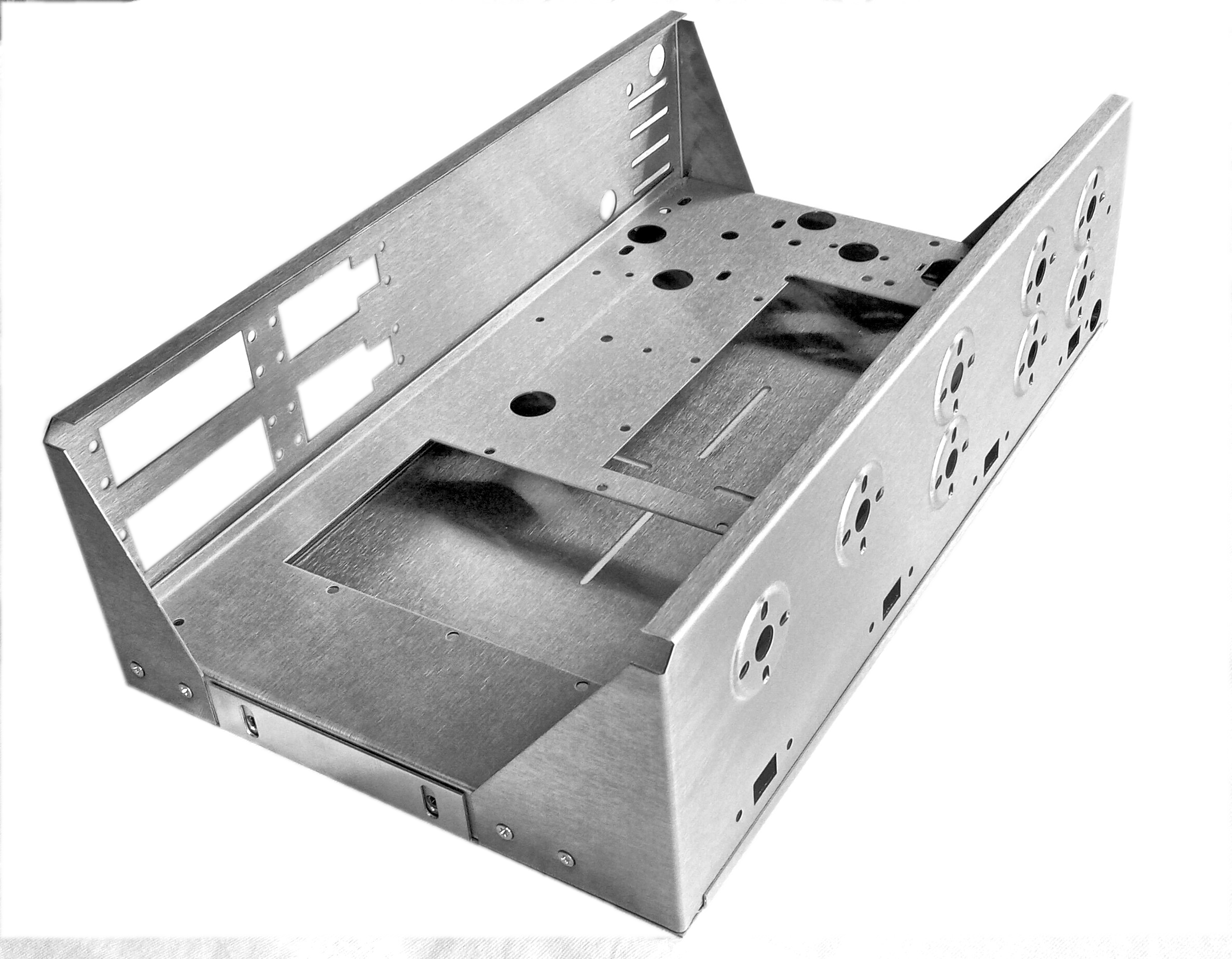 The Stainless Steel chassis has a modern brushed industrial finish and vented bottom cover. The chassis kit includes AC plug outlet covers, plastic hole bushings, power cord grommet and basic panel assembly hardware.