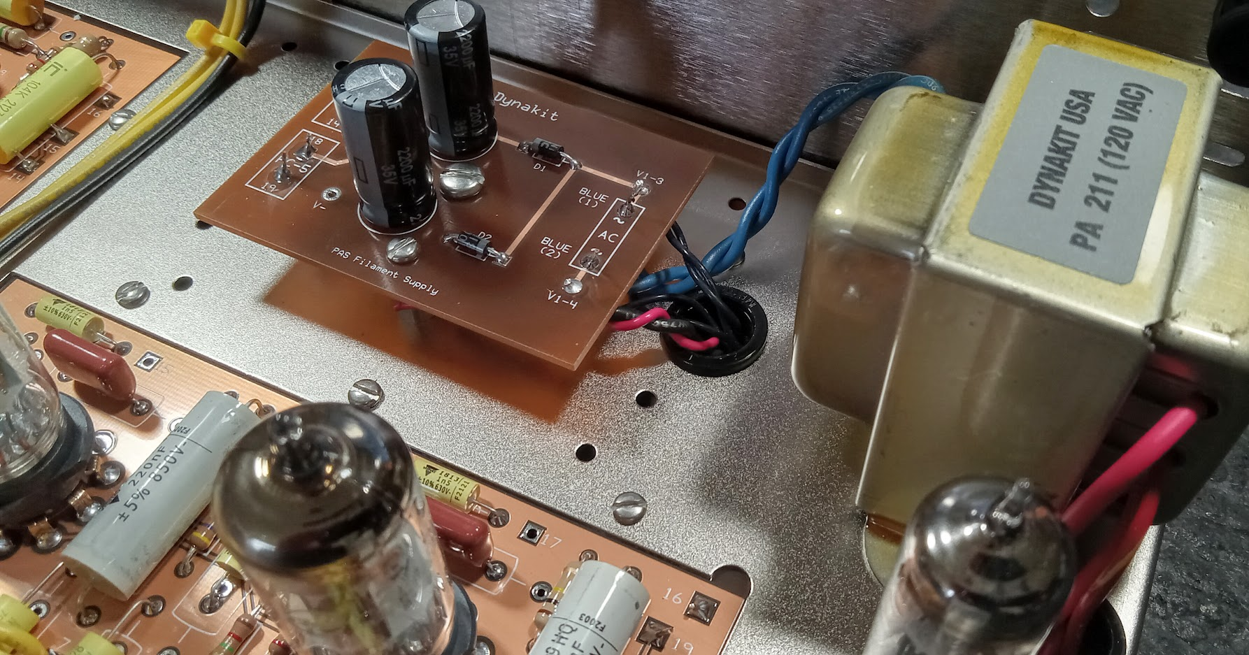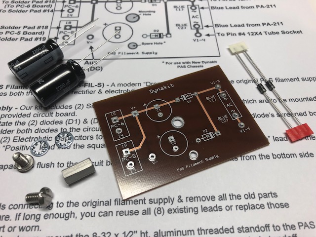 A modern drop-in replacement filament supply for your new or vintage PAS Preamplifier. Aerospace quality brown Polyimide circuit board with solder mask and silk screened component layout for simple trouble free installation. Includes all components, mounting hardware and step by step instructions. Replace that aging selenium rectifier and those dried out electrolytic capacitors. Components include (2) Silicon Diodes & (2) 2,200 uF electrolytic capacitors.